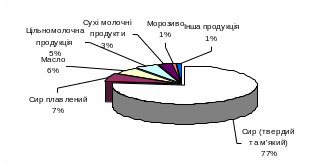 Основною продукцiєю пiдприємства є продукцiя, вироблена з молочної сировини: твердi сири, плавленi сири, масло вершкове, морозиво, сухi молочнi продукти та рiзноманiтний асортимент продукцiї з незбираного молока (рис. 2.1, 2.2).