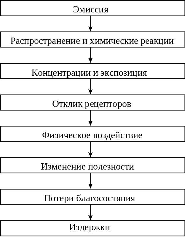 Пути воздействия – это последовательность событий, связывающих "причину воздействия" и последующую оценку, как показано на рис. 1. Последовательно, эмиссия преобразуется в загрязняющее вещество, которое, в свою очередь, воздействует на отдельные рецепторы в физической форме. Каждое физическое воздействие приводит к изменению степени полезности или прямых затрат, или сокращению благосостояния. Затем эта потеря экономического или нематериального благосостояния выражается в денежном эквиваленте как издержки воздействия.