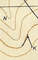 Далее, установив раствор измерителя равным полученному значению d, ставят одну его ножку в начальную точку K, а другой засекают ближайшую горизонталь и тем намечают точку трассы, из которой в свою очередь засекают следующую горизонталь, и т.д. (см. рис. 38).