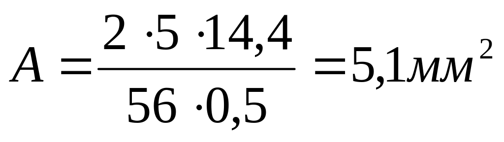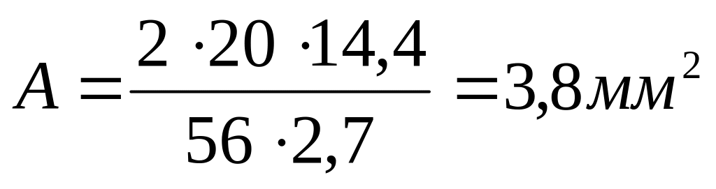 Қалыпты режимдегі батарея мен жүктеме арасындағы кернеудің азайып кетуі маңызды емес, өйткені жүйенің куернеуі аккумуляторлардың зарядталу– 54 В. Критикалық сәті разрядтың шекті кернеуі 43,2 В (1,8 В/эл.) болған кездегі батарея разрядында орын алады, ал клеммалардағы минималды кернеу 40,5 В төмен болмауы керек, яғни азайып кету 2,7В аспауы шарт. Онда 5.7 формуласы бойынша батарея мен жүктеме арасындағы кабель қимасы: