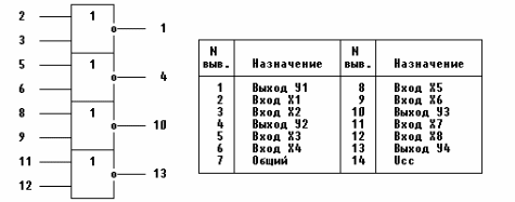 В состав микросхемы входят четыре двух входовых элемента И-НЕ. Функциональная схема и номенклатура выводов микросхемы приведены на рис. 2.2.