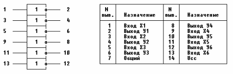 В состав микросхемы входят шесть инверторов. Функциональная схема и номенклатура выводов микросхемы приведены на рис. 2.5.