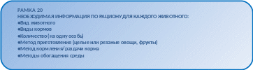 В природе рацион животных меняется в течение года. В таблице 16 показаны сезонные изменения в рационе бурого медведя (Ursus arctos). Для стимуляции зимней спячки они получают более обильное и разнообразное питание весной и летом, а с ноября по март количество корма снижается. Для составления рационов необходимо привлекать ветеринарных врачей и других специалистов. Еще большее внимание необходимо уделять питанию больных и беременных особей. В среде зоологов зоопарков накопилось много знаний о кормлении животных различных видов. Рабочая группа ЕАЗА по питанию также располагает значительной информацией по этому вопросу. Накопленные знания можно использовать при составлении рационов для зоопарковских животных (см. Рамку 20).