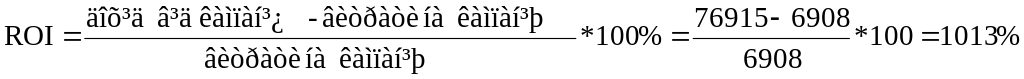 1013% означає, що на кожну вкладену гривню в рекламну кампанію готель "Гостинний Дім" буде отримувати 10 гривень чистого прибутку. Слід зазначити, що ROI вважається гарним, якщо більше 300%, а 500% і більше - відмінним.