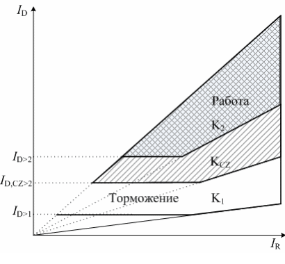 срабатывание «общей» зоны защиты с учетом торможения: ID,CZ > KТ,CZ ∙ IR,CZ;