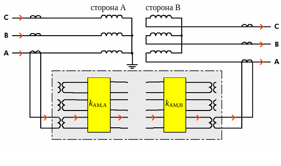 На стороне трансформатора, соединенной в «звезду», вторичные обмотки соединяют в «треугольник», а на стороне «треугольника» ТТ собирают в «звезду». В зависимости от группы соединения обмоток защищаемого объекта, вектора токов стороны А и сторон B, C и D могут отличатся как по величине, так и по направлению.
