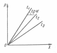 Уравнение(13.4) показывает, что зависимость между равновесными концентрациями распределяемого компонента в газовой смеси и в жидкости выражается прямой линией, проходящей через начало координат, тангенс угла наклона которой равен . Тангенс угла наклона зависит от температуры и давления. С увеличением давления и уменьшением температуры растворимость газа в жидкости увеличивается ( снижается) (рис. 13.1). Когда в равновесии с жидкостью находится смесь газов, то закону Генри может следовать каждый из газовых компонентов смеси.