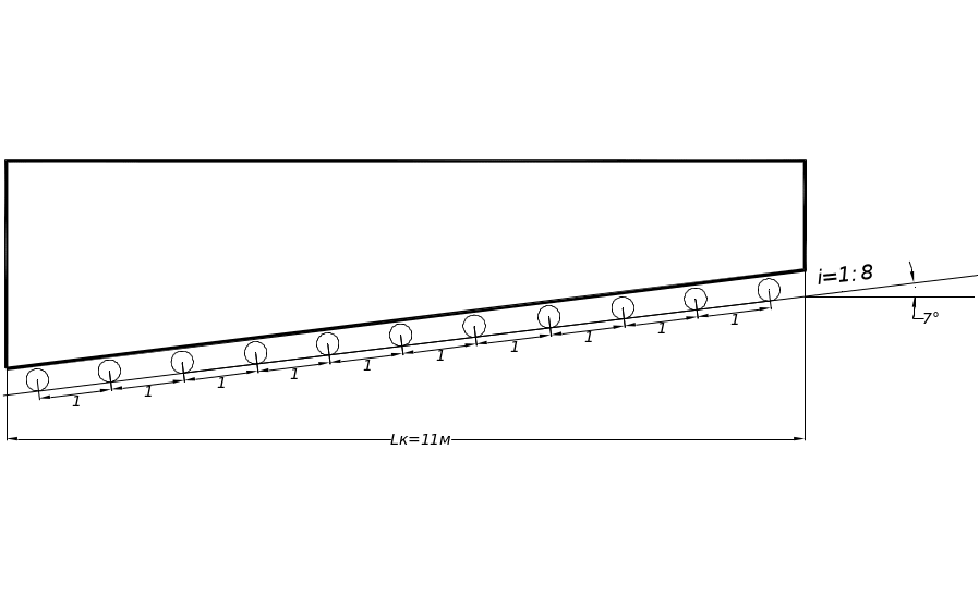 Согласно заданию конструкцию судовозных путей спускового стапеля принята в виде ж/б балки на ленточном фундаменте, на котором закреплены рельсовые пути типа Р-50. Балки имеют форму плиты с двумя направлениями вверх прямоугольными рёбрами, т.е. каждый рельс на одной балке с шириной ребра 0,4м; 2 балки объединены в плеть с шириной 2,2м расстояние между рельсами в одной дорожке 1,52. Длина балок равна длине стандартного рельса l = 12,5м; по длине 2 плети соединены так жёстко, что секции по длине имеют температурно-осадочные швы через 25м. Расстояние между катками косяковой тележки принимаем в осях 1м. Всего при Lк = 7,1м имеем 11 катков, на каждый каток действует нагрузка 225кН.