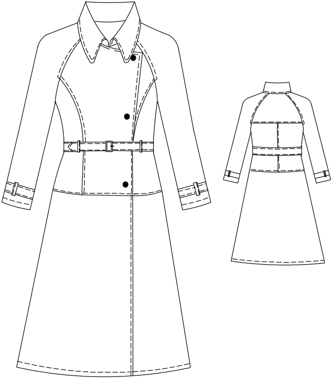Выберете исходные данные из таблиц абсолютных величин измерений типовых фигур женщин (164-96-104) и прибавки, необходимые для построения чертежа конструкции женского плаща в соответствии с эскизом модели (значения занесите в таблицы 1 и 2). Выполните расчеты и постройте чертеж основы женского плаща и рукава (значения занесите в таблицу 3). |