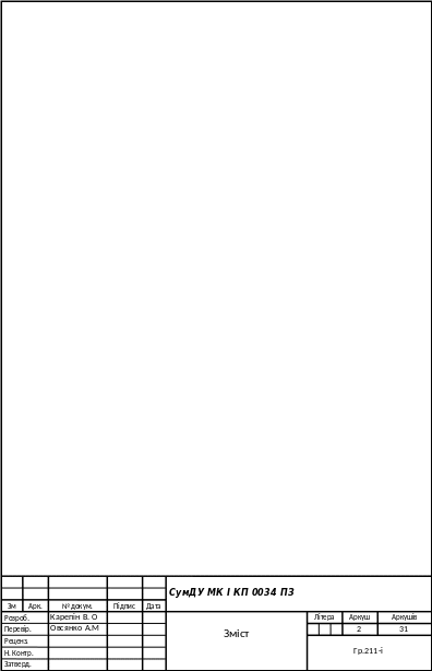 Вступ……..………………………………………………………………..…...4 1 Теоретичний розділ………………………………………………….……...5 1.1 Типи даних………………………………………………………….……..5 1.1.1 Машинні типи даних…………………………………...…………….…5 1.1.2 Складні типи даних……………………………………………….…….5 2 Масив………………….………………………………………………….….6 2.1 Ініціалізація масивів………………………………………………….…...7 2.2 Доступ до елементів масиву……………………………………….……..8 2.3 Багатомірні масиви…………………………………………………….….8 2.4 Характеристика масиву…………………………………………………...9 3 Рядок …………………………………………………………………..…...10 3.1 Оголошення символьних рядків……………………………………......10 3.2 Ініціалізація символьного рядка…………………………………...…...10 4 Структура…………………………………………………………...….…..12 5 Файли…………………………………………………………………….....13 5.1 Типи файлів і оголошення файлових змінних………………………....13 5.2 Закриття файлів……………………………………………………….....14 5.3 Операції керування файлами………………………………………...….14 6. Вказівники…………………………………………………………………15 6.1 Операції з вказівниками…………………………………………………15