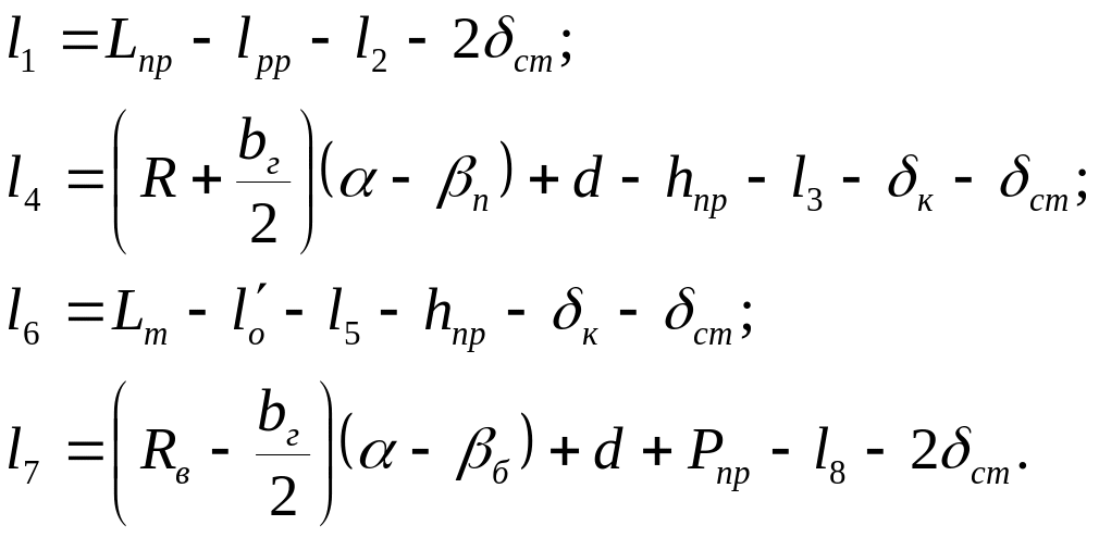 Якщо обчислені за формулою (6.1) якісь рейки, наприклад l4 і l6, виявляться коротше 4,5 м, то їх необхідно подовжити, а прилягаючі до них рейки l3 і l5 зробити коротшими. Одночасно з цим необхідно укоротити до тієї ж довжини рейки l1 і l7. Можна кратними довжині цілої рейки приймати ходові рейки біля контррейок l2 і l8, тоді визначенню підлягають рейки l1 і l7 з використанням тих же формул (6.1).