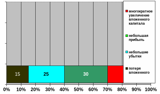 По оценке экономистов в 15% случаев рискокапитал полностью теряется; 25% рискофирм несут убытки в течение более длительного времени, чем предполагалось первоначально; 30% рискофирм дают весьма скромную прибыль, но в 30% случаев успех позволяет в течение всего нескольких лет многократно перекрыть прибылью все вложенные средства. В 1986—1993 гг. доходы фондов рискового капитала в США в среднем в 10—20 раз превышали сумму вложенного капитала.