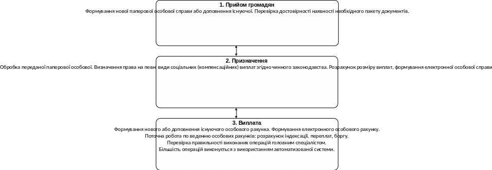 Робота підрозділів прийому, обробки (призначення), виплати соціальних допомог, компенсацій тощо зводиться до послідовної обробки особових справ, що поступово формуються проходячи шлях від моменту звернення громадянина до формування та друку виплатних відомостей. На даний момент принципи організації роботи вказаних підрозділів чітко визначенні „Єдиною технологією прийому громадян”, що застосовується в управліннях праці та соціального захисту населення України. Нище наведена діаграма показує основні етапи роботи з особовими справами в УПСЗН(рис. 6.1.):