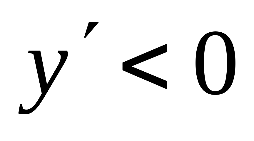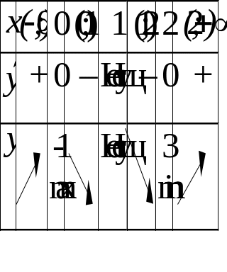 (В первой строке записываются критические точки и интервалы, на которые делят эти точки ось OX; во второй строке указываются значения производной в критических точках и знаки на интервалах. Знаки определяются методом частных значений. В третьей строке указываются значения функции y(x) в критических точках и показывается поведение функции – возрастание или убывание на соответствующих интервалах числовой оси. Дополнительно обозначается наличие минимума или максимума.