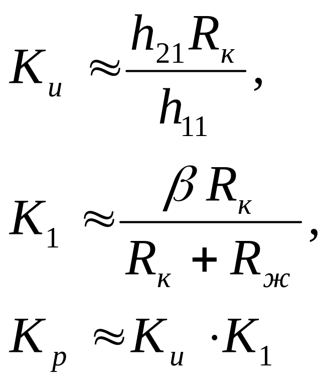 Эмиттері ортақ күшейткіш каскадтың кернеуді Кu, токты К1 және қуатты Кр күшейту коэффициенттерін төмендегі өрнектерден жуықтап табуға болады.