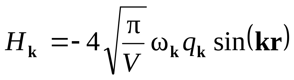 Заметим, что, поскольку операторы уничтожения и рождения фотонов являются эрмитовски-сопряженными, операторы обобщенной координаты и импульса являются самосопряженными (эрмитовыми), как это следует из их определения (2.40) –– (2.43). Известно, что собственные значения эрмитовых операторов являются действительными числами, а их собственные функции взаимно ортогональны. С другой стороны, наблюдаемым физическим величинам в квантовой механике как раз соответствуют эрмитовы операторы. Так что в отличие от неэрмитовых операторов уничтожения и рождения фотонов операторам обобщенной координаты и обобщенного импульса электромагнитного поля должны соответствовать наблюдаемые характеристики поля. Действительно, если рассматривать разложение электромагнитного поля не на бегущие волны, как это представлено выражением (2.1), а на стоячие волны, то напряженности электрического и магнитного поля пространственных гармоник могут быть выражены через обобщенные координаты и импульсы: