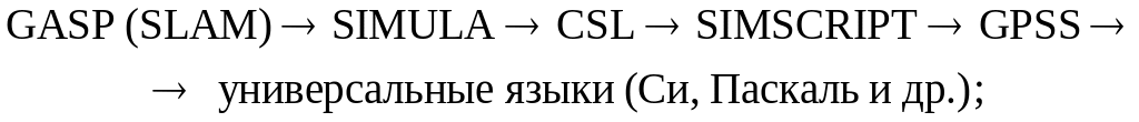 Каждой из рассмотренных схем отсчета событий отвечает своя группа языков имитационного моделирования. В отдельную группу выделяется язык GPSS, хотя формально его можно отнести к языкам процессов. Проблемной областью GPSS являются СМО.
