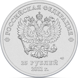 в нижней части диска, у канта — горизонтальная надпись: «25 РУБЛЕЙ», под ней — год чеканки, над ней справа — товарный знак монетного двора.
