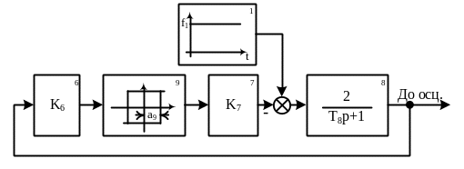 Встановити стале значення а9=2, зняти осцилограми автоколивань у тій же системі за таких значень коефіцієнта підсилення: К7=0,2; 1; 5 і при f1=0В.