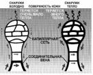 В первом случае поры кожи и сосуды сужены, теплоотдача минимальна, реакция на холод.. Во втором – наоборот, сосуды и поры кожи расширены теплоотдача максимальна, нервная система организма предотвращает перегрев.