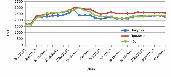 Проанализируем динамику наличных курсов продажи и покупки доллара США, евро и российского рубля, предлагаемого АО «Ощадбанком» за период с 02.02.2015 г. по 02.04.2015 г. Рассчитаем абсолютную и процентную маржу.