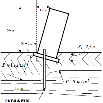 Быстрая загрузка элеватора полезной нагрузкой и не учет свойств несущего слоя грунта – глины привели к перегрузке основания и возникновению выпора грунта из-под фундамента. Построенное сооружение деформировалось и значительно накренилось, возникла аварийная ситуация (см. рис.).