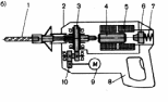 Рассмотрим конструкцию и принцип работы электрических молотков (рис. 8.11). Привод молотка осуществляется от однофазного коллекторного электродвигателя 13 с двойной изоляцией в пластмассовом корпусе, выполненного заодно с ос- а) новной рукояткой 14, в которую вмонтированы курковый выключатель с фиксированным рабочим положением и устройство для подавления радиопомех. К корпусу крепится боковая рукоятка. Ствол 6 и корпус редуктора 12 — алюминиевые.