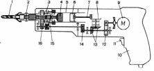 Рассмотрим конструкцию и принцип действия электрических перфораторов (рис. 8.13). От однофазного коллекторного электродвигателя 9 с вентилятором приводятся в действие компрессионно-вакуумный, ударный и вращательный механизмы, помещенные в алюминиевом стволе с виброизоляцией. Корпус электродвигателя — пластмассовый и выполнен заодно с основной рукояткой 10 пистолетного типа, в которую вмонтированы выключатель 11, устройство для подавления радиопомех и кабельный ввод.