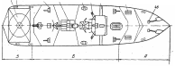ходовая рубка; 18 — пусковая ракетная установка; 19 — волнорез; 20 — шпилевая; 21 — боцманская кладовая; 22 — антенна ГАС; 23 — ценной ящик; 24, 35 —цистерна пресной воды; 25 — погреб РГБ; 26, - провизионная кладовая; 27 — носовой кубрик; 28 — агрегатная ракетной установки; 29 — кают-компания _ офицеров; 3O — каюты офицеров; 31 — камбуз; 32 — топливная цистерна; 33 — масляная цистерна; 34 — столовая команды; 37— артпогреб; 38 — вертолетная площадка; 39 — кнехт; 40 — автомат; 41 — торпедный аппарат; 42 — шлюпка; 43— трап; 44 крыло ходового мостика; 45 — РБУ; 46 — якорно-швартовый шпиль