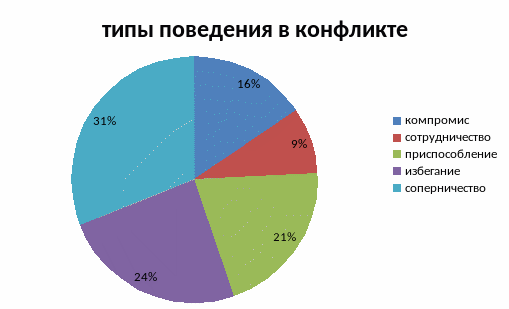 Большинство испытуемых 31%(18 человек) выбирают соперничество как преобладающий тип поведения в конфликте. А вот сотрудничество преобладает только у 9%(5 человек) испытуемых.