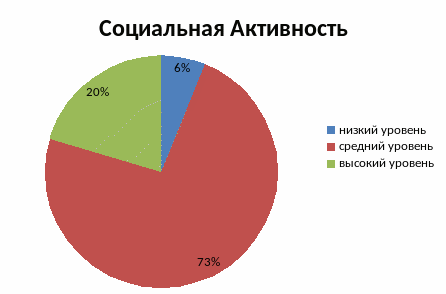 Из диаграммы видно что 6%(3 человека) имеют низкие показатели, 80%(36 человек) имеют средние показатели, и 20%(10 человек) имеют высокие показатели.