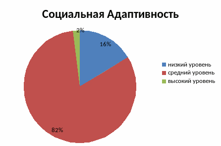 Как видно из диаграммы 16%(8человек) имеют низкий показатель, средний показатель выявлен у 82%(40 человек), и высокий показатель у 2%(1 человек).
