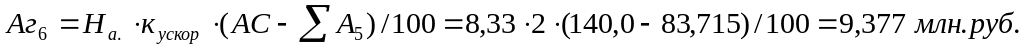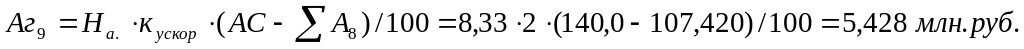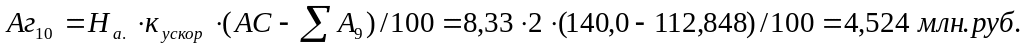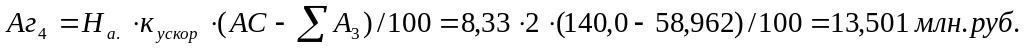 При этом методе годовая величина амортизационных отчислений рассчитывается исходя из остаточной стоимости объекта на начало года (Фп-ΣАi), нормы амортизационных отчислений (На), исчисленной исходя из линейного метода и коэффициента ускорения (до 2,5 раза). Расчет ведется по формуле:
