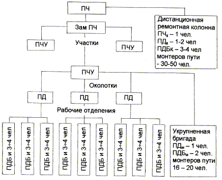 Дистанция пути (ПЧ) делится на участки пути во главе со старшим дорожным мастером, а они в свою очередь подразделяются на околотки пути, возглавляемые дорожными мастерами, а околотки – на рабочие отделения, к которым прикреплены путевые бригады во главе с бригадирами пути.