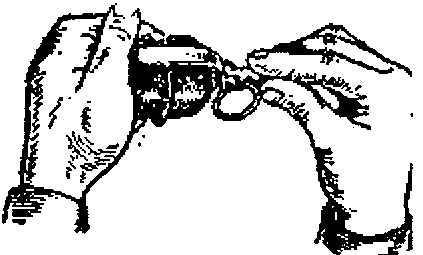 - продолжая плотно прижимать спусковой рычаг, другой рукой сжать (выпрямить) концы предохранительной чеки и за кольцо пальцем выдернуть ее из запала;
