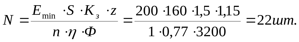 Для производственного помещения выбираем рабочее равномерное общее освещение. Характер зрительных работ- работы малой точности. Разряд зрительной работы V. Подразряд зрительной работы б. Норма освещенности для данного производственного помещения: Еmin= 200 Лк.