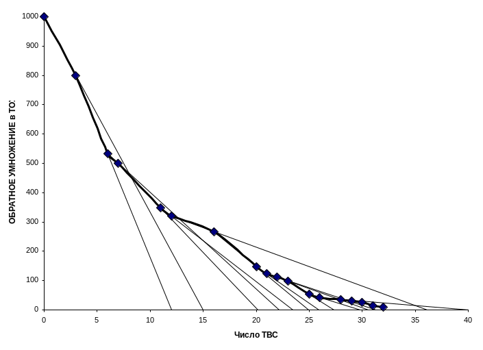 В «нулевом» состоянии измеряется ток ионизационной камеры (ИК) - это I0, соответственно У0=1 и ОУ0=1. Затем загружается порция ТВС (n ТВС) и замеряется ток ИК - это In или Ii. Вычисляется У и ОУ. Значения ОУ0 и ОУn откладывают на графике зависимости ОУ от числа n ТВС. Через эти две точки проводят прямую и экстраполируют ее до пересечения с осью n ТВС. Это и есть первое экстраполированное значение критического состояния. Все данные (причем детально) по состоянию и положению стержней, температур, тока ИК, времени и т.п. заносят в журнал. Реальная форма кривой может иметь как вогнутый, так и выпуклый характер (что запрещено, так как экстраполяция занижает критическое состояние, что весьма опасно).
