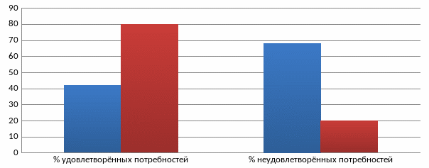 Соотношение удовлетворённых и неудовлетворённых потребностей по гигиеническим факторам