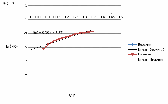 Переход графика в область с более сильным наклоном (верхнюю) обусловлен тем, что начиная с некоторого тока прекращается рекомбинация в ОПЗ и доминируют процессы инжекции. Большой коэффициент неидеальности можно объяснить наличием большого числа ловушек на границе p-n перехода, а также погрешностью измерений начальных данных. С увеличением напряжения между анодом и катодом наступает момент заполнения всех ловушек носителями, и ток начинает расти сильнее от приложенного напряжения.