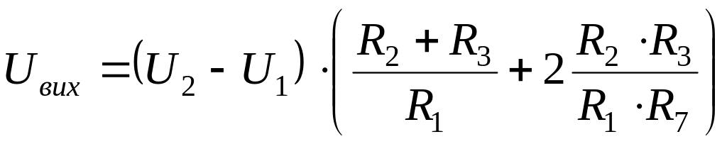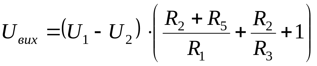 Вихідні опори джерел вхідних сигналів U1 і U2 включаються послідовно з опорами R1 і R3 і впливають на коефіцієнти підсилення цих сигналів. Якщо опори джерел сигналів приблизно рівні, то доцільно для дотримання співвідношення ( ) прийняти R3=R1 і R4=R2. В цьому випадку наявність не рівних нулю опорів джерел сигналів вплине на коефіцієнт підсилення диференційного сигналу, але не буде приводити до порушення умови “диференційності” підсилювача, тобто коефіцієнт підсилення синфазного сигналу залишатиметься близьким до нуля.