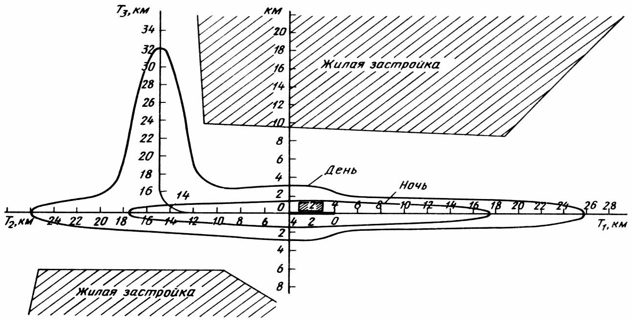 Минимально допустимое расстояние аэродромов от населенных пунктов назначено в «Строительных нормах и правилах (СНиП) «Аэродромы» для снижения вредного шумового воздействия самолетов на населенные пункты. Это воздействие показано на рис.3.