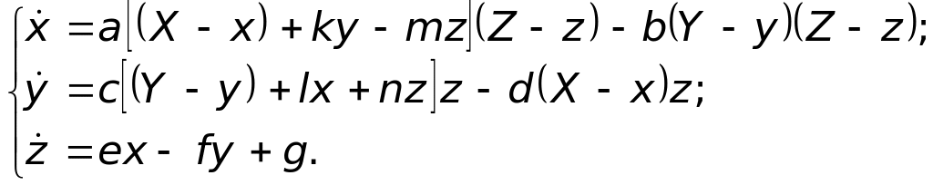 Здесь переменными являются: х – количество автобусов, находящихся на остановке; у – количество пассажиров, ожидающих посадку; z – число свободных мест в автобусах, находящихся на остановке. Остальные параметры имеют следующий смысл: Х – среднее (нормативное) число автобусов, работающих на маршруте; Y – среднее количество пассажиров на остановке (условная «вместимость» остановки); Z – среднее число мест для пассажиров (вместимость автобуса). Коэффициенты модели характеризуют: а – интенсивность прибытия автобусов на остановку (имеет размерность 1/(мест·мин)); b – интенсивность отправления автобусов от остановки (авт/(пасс·мест·мин)); с – интенсивность посадки пассажиров в автобусы (пасс/авт·мест·мин)); d – интенсивность прибытия пассажиров на остановку (1/мин); е – скорость уменьшения числа свободных мест вследствие посадки пассажиров (1/(пасс·мин)); f – интенсивность увеличения числа свободных мест за счет высадки пассажиров (1/мин); g – скорость роста числа свободных мест, «прибывающих» вместе с автобусами (1/авт·мин)); h – интенсивность «убывания» свободных мест, не занятых пассажирами до отправления автобуса (1/пасс·авт·мин)); k – интенсивность выхода на линию автобусов сверх нормативного значения при увеличении числа пассажиров на остановках (авт/пасс); m – интенсивность «схода» автобусов с маршрутов вследствие роста числа свободных мест (авт/мест).
