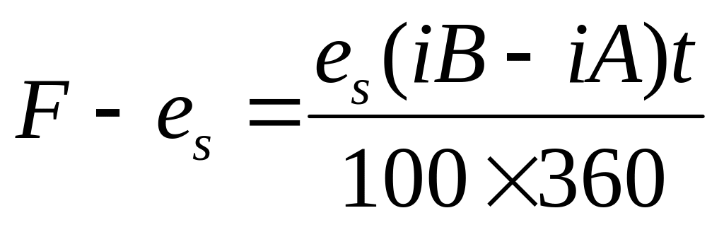 де F – форвардний валютний курс; es – курс-спот (кількість національної валюти на одиницю іноземної); iА, iВ – процентні ставки по депозитах в іноземній і національній валюті; t - строк форварда (у днях).