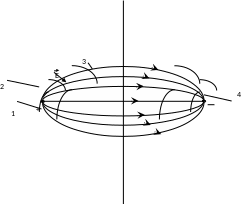 1- позитивний точковий заряд; 2 - еквіпотенціальна поверхня; 3 - силова лінія; 4 – негативний заряд; – вектор напруженості електричного поля.