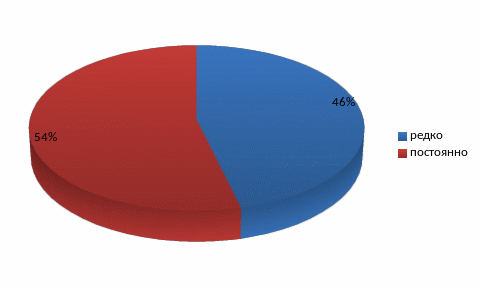Да данной диаграмме мы можем видеть, что 54% женщин постоянно совершают прогулки пешком. 46% - редко прогуливаются пешком.