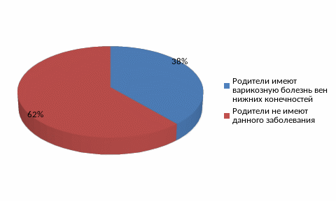 Варикозная болезнь нижних конечностей у родителей подвержена у 38% опрошенных. У 62% опрашиваемых родители не имеют варикозной болезни вен нижних конечностей.