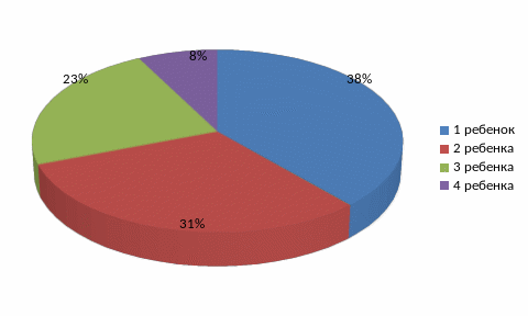 в Ходе анкетирования было выявленно - 38% опрошенных были беременны и имели всего 1 роды, 32% имели 2 детей, 23%- троих и всего 8% имеют 4 детей.