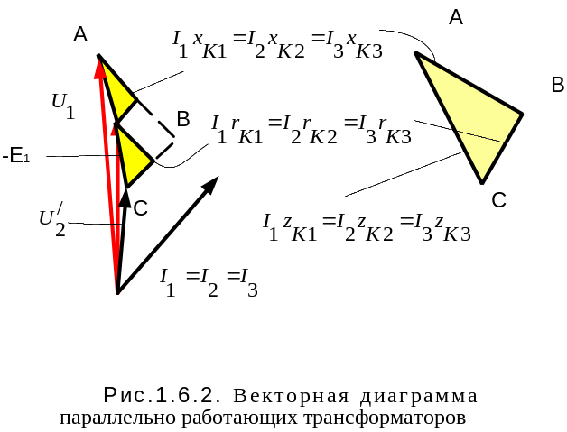 При выполнении условий векторные диаграммы трансформаторов совпадают и токи складываются арифметически. Нагрузка распределяется пропорционально их номинальной мощности, отсутствуют уравнительные токи. При включении на параллельную работу трансформаторы должны быть сфазированы. Порядок фазировки изучается в лаборатории.
