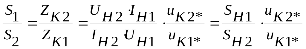 Параллельная работа трансформаторов при различных напряжениях короткого замыкания при соблюдении двух других условий не сопровождается возникновением уравнительного тока, но нагрузка между трансформаторами распределяется обратно пропорционально их внутренним сопротивлениям, то есть пропорционально номинальной мощности и обратно пропорционально напряжению короткого замыкания.