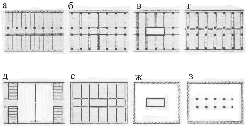 а - с неполным каркасом; б - каркасно-диафрагмовая; в - каркасно-стволовая; г - каркасно-блочная; д - блочно-стеновая (блочно-панельная); е - ствольно-стеновая; ж - оболочково-стволовая; з - каркасно-оболочковая.
